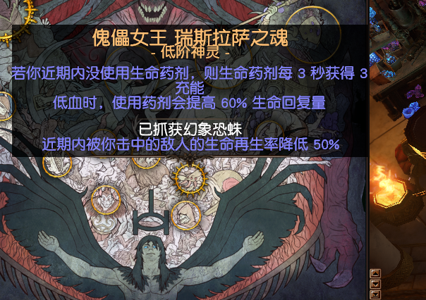 近期内被你击中的敌人生命再生率降低50%”这个小神对应的是停滞区的泽蒙哥,而不是它显示的异蛛巢穴的幻象恐蛛。